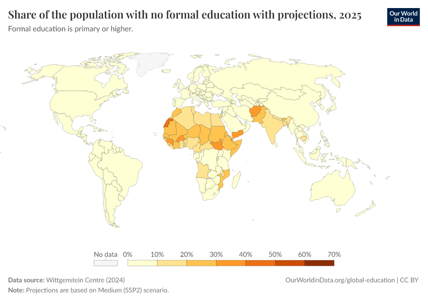 “Data Page: Share of the population with no formal education with projections”, part of the following publication: Hannah Ritchie, Veronika Samborska, Esteban Ortiz-Ospina, and Max Roser (2023) - “Global Education”. Data adapted from Wittgenstein Centre. Retrieved from https://chart-preview-extension.owid.pages.dev:8789/20260212-032504/grapher/share-of-the-population-with-no-formal-education-with-projections.html [online resource] (archived on February 12, 2026).How to cite this data