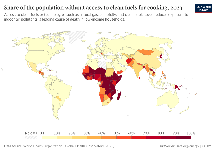 World Health Organization - Global Health Observatory (2025) – processed by Our World in Data. “Share of the population without access to clean fuels for cooking” [dataset]. World Health Organization, “Global Health Observatory” [original data]. Retrieved February 12, 2026 from https://chart-preview-extension.owid.pages.dev:8789/20260119-070102/grapher/share-of-the-population-without-access-to-clean-fuels-for-cooking.html (archived on January 19, 2026).