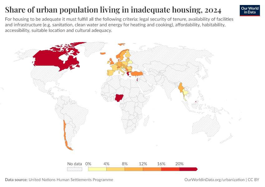 United Nations Human Settlements Programme – processed by Our World in Data. “Share of urban population living in inadequate housing” [dataset]. United Nations Human Settlements Programme, “Data from multiple sources” [original data]. Retrieved February 12, 2026 from https://chart-preview-extension.owid.pages.dev:8789/20251120-211749/grapher/share-of-urban-population-living-in-inadequate-housing.html (archived on November 20, 2025).