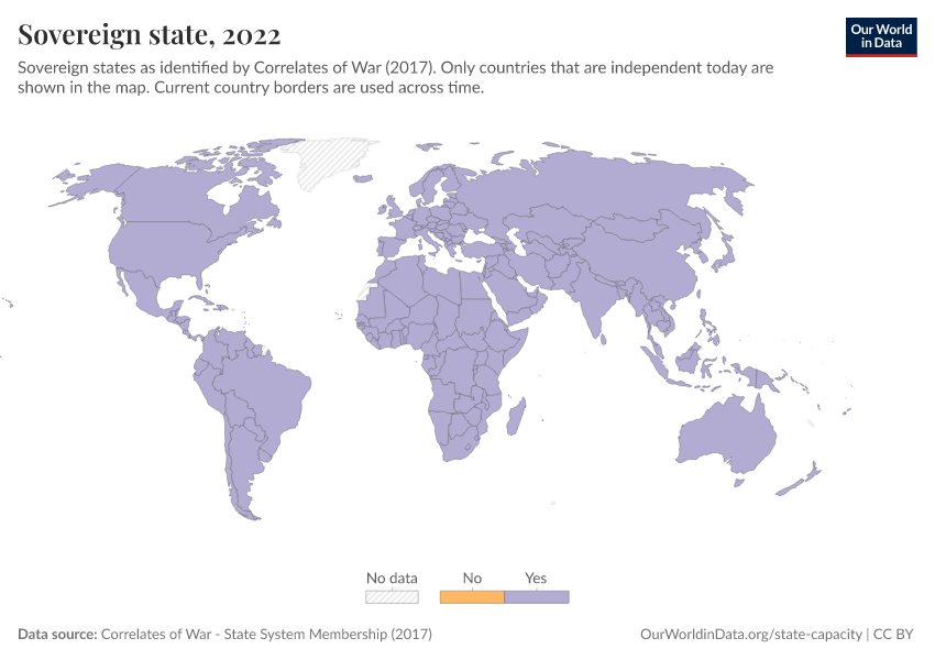 “Data Page: Sovereign state”, part of the following publication: Bastian Herre and Pablo Arriagada (2023) - “State Capacity”. Data adapted from Correlates of War. Retrieved from https://chart-preview-extension.owid.pages.dev:8789/20251208-134119/grapher/sovereign-state-cow.html [online resource] (archived on December 8, 2025).How to cite this data