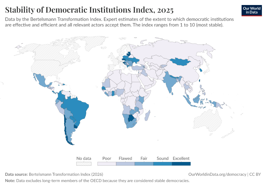 “Data Page: Stability of Democratic Institutions Index”, part of the following publication: Bastian Herre, Lucas Rodés-Guirao, and Esteban Ortiz-Ospina (2013) - “Democracy”. Data adapted from Bertelsmann Transformation Index. Retrieved from https://chart-preview-extension.owid.pages.dev:8789/20260105-133053/grapher/stability-democratic-institutions-index-bti.html [online resource] (archived on January 5, 2026).How to cite this data