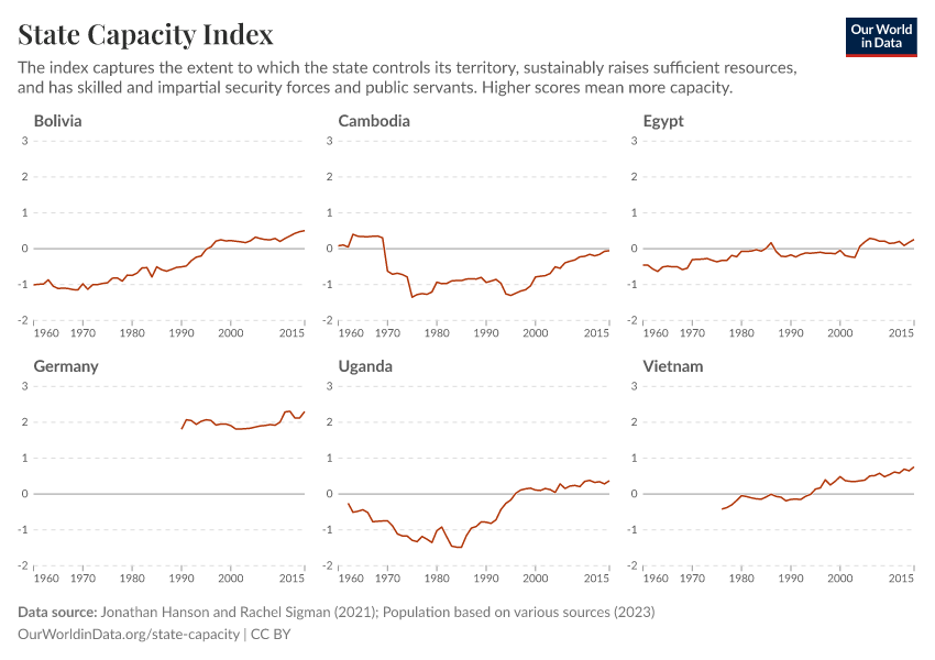 “Data Page: State Capacity Index”, part of the following publication: Bastian Herre and Pablo Arriagada (2023) - “State Capacity”. Data adapted from Jonathan Hanson and Rachel Sigman, Various sources. Retrieved from https://chart-preview-extension.owid.pages.dev:8789/20260105-133053/grapher/state-capacity-index.html [online resource] (archived on January 5, 2026).How to cite this data
