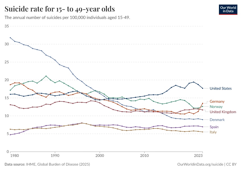 “Data Page: Suicide rate for 15- to 49-year olds”, part of the following publication: Esteban Ortiz-Ospina and Max Roser (2016) - “Global Health”. Data adapted from IHME, Global Burden of Disease. Retrieved from https://chart-preview-extension.owid.pages.dev:8789/20260211-174736/grapher/suicide-rate-for-15--to-49-year-olds.html [online resource] (archived on February 11, 2026).How to cite this data