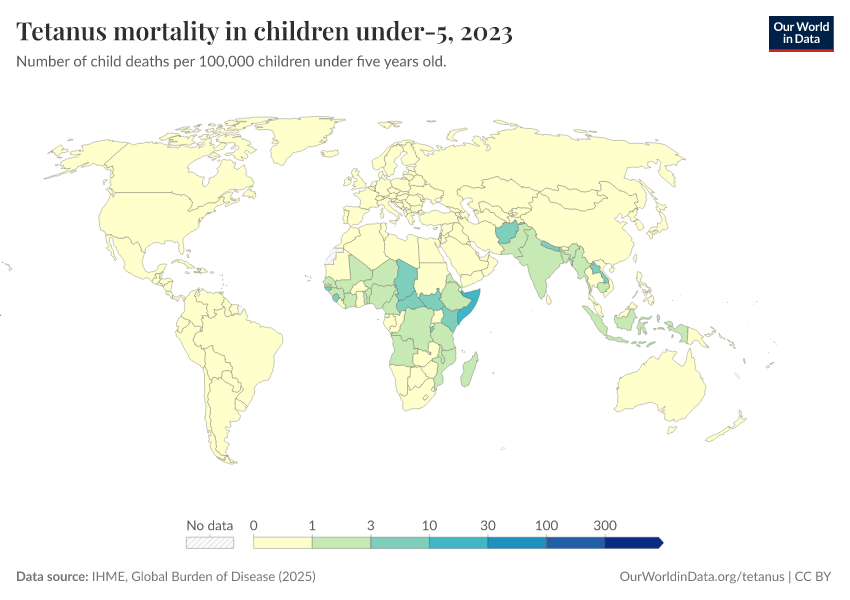 IHME, Global Burden of Disease (2025) – with major processing by Our World in Data. “Tetanus mortality in children under-5” [dataset]. IHME, Global Burden of Disease, “Global Burden of Disease - Deaths” [original data]. Retrieved February 12, 2026 from https://chart-preview-extension.owid.pages.dev:8789/20260211-174736/grapher/tetanus-mortality-in-children-under-5.html (archived on February 11, 2026).
