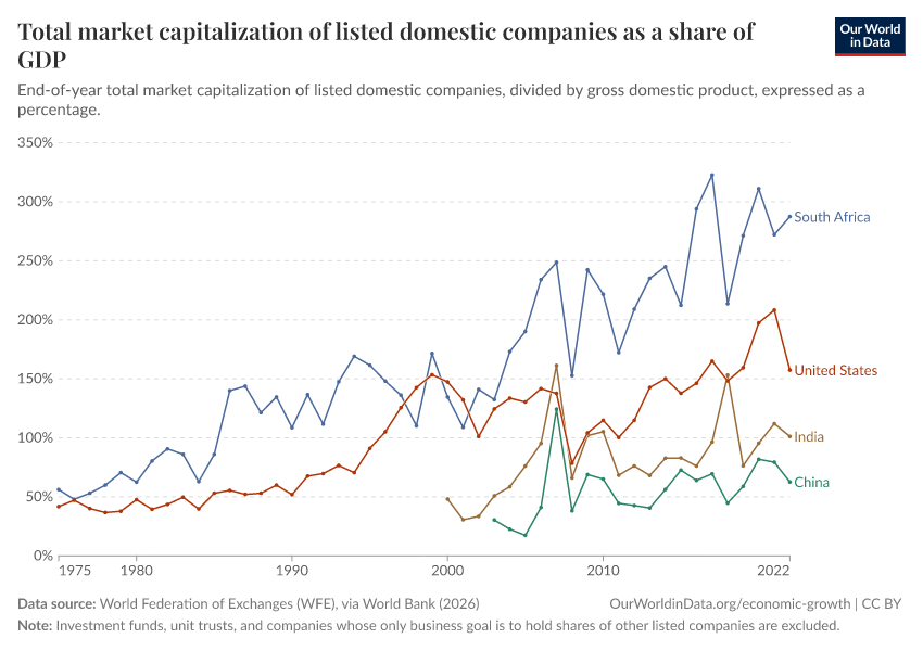 “Data Page: Total market capitalization of listed domestic companies as a share of GDP”. Our World in Data (2026). Data adapted from World Federation of Exchanges (WFE), via World Bank. Retrieved from https://chart-preview-extension.owid.pages.dev:8789/20260202-181317/grapher/total-market-capitalization-listed-domestic-companies-share-gdp.html [online resource] (archived on February 2, 2026).How to cite this data