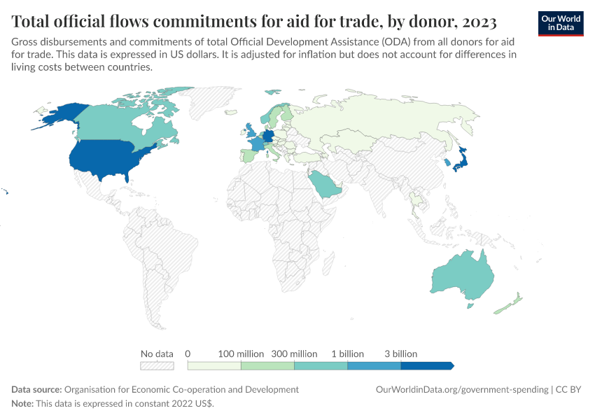 “Data Page: Total official flows commitments for aid for trade, by donor”. Our World in Data (2026). Data adapted from Organisation for Economic Co-operation and Development. Retrieved from https://chart-preview-extension.owid.pages.dev:8789/20251120-211038/grapher/total-oda-for-aid-for-trade-by-donor.html [online resource] (archived on November 20, 2025).How to cite this data