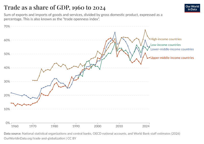 “Data Page: Trade as a share of GDP”. Our World in Data (2026). Data adapted from National statistical organizations and central banks, OECD national accounts, and World Bank staff estimates. Retrieved from https://chart-preview-extension.owid.pages.dev:8789/20260202-180243/grapher/trade-as-share-of-gdp.html [online resource] (archived on February 2, 2026).How to cite this data