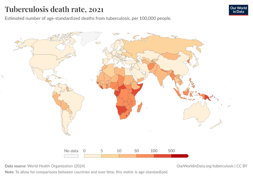 World Health Organization (2024) – with major processing by Our World in Data. “Tuberculosis death rate” [dataset]. World Health Organization, “Global Health Estimates” [original data]. Retrieved February 12, 2026 from https://chart-preview-extension.owid.pages.dev:8789/20250909-093708/grapher/tuberculosis-death-rate-age-standardized.html (archived on September 9, 2025).