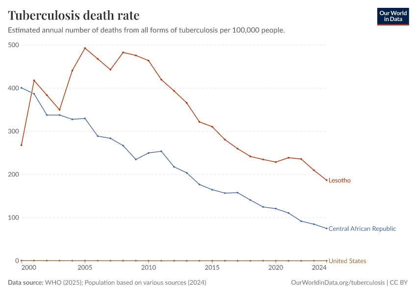 WHO (2025); Population based on various sources (2024) – with minor processing by Our World in Data. “Tuberculosis death rate” [dataset]. WHO, “Global Tuberculosis Report - Burden Estimates”; Various sources, “Population” [original data]. Retrieved February 12, 2026 from https://chart-preview-extension.owid.pages.dev:8789/20260205-170810/grapher/tuberculosis-death-rate.html (archived on February 5, 2026).