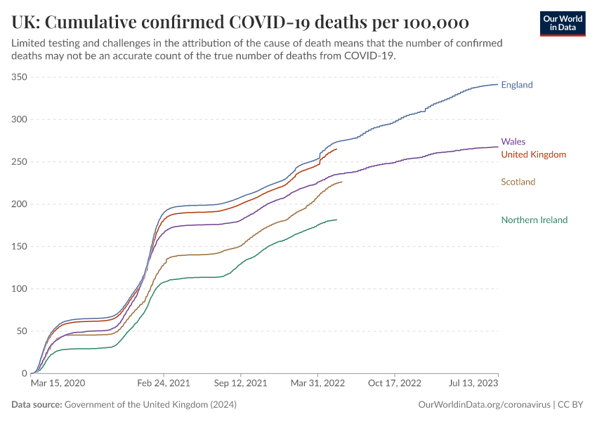 Government of the United Kingdom (2024) – with minor processing by Our World in Data. “UK: Cumulative confirmed COVID-19 deaths per 100,000” [dataset]. Government of the United Kingdom, “UKHSA data dashboard” [original data]. Retrieved February 12, 2026 from https://chart-preview-extension.owid.pages.dev:8789/20250909-093708/grapher/uk-cumulative-covid-deaths-rate.html (archived on September 9, 2025).