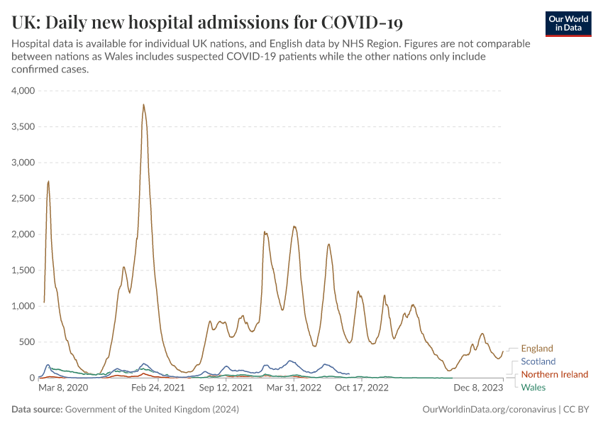 Government of the United Kingdom (2024) – with minor processing by Our World in Data. “UK: Daily new hospital admissions for COVID-19” [dataset]. Government of the United Kingdom, “UKHSA data dashboard” [original data]. Retrieved February 12, 2026 from https://chart-preview-extension.owid.pages.dev:8789/20250909-093708/grapher/uk-daily-covid-admissions.html (archived on September 9, 2025).