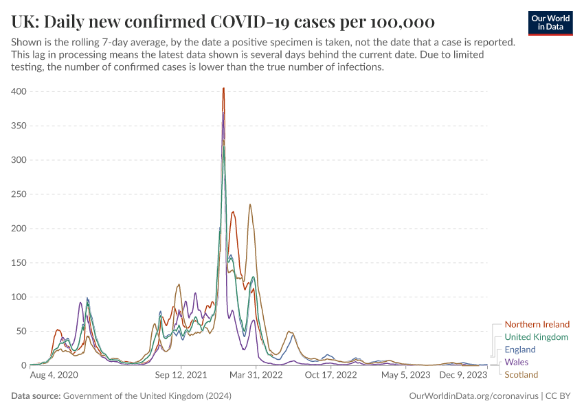 Government of the United Kingdom (2024) – with minor processing by Our World in Data. “UK: Daily new confirmed COVID-19 cases per 100,000” [dataset]. Government of the United Kingdom, “UKHSA data dashboard” [original data]. Retrieved February 12, 2026 from https://chart-preview-extension.owid.pages.dev:8789/20250909-093708/grapher/uk-daily-covid-cases-7day-average.html (archived on September 9, 2025).