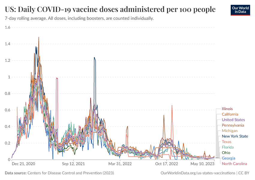 Centers for Disease Control and Prevention (2023) – processed by Our World in Data. “US: Daily COVID-19 vaccine doses administered per 100 people” [dataset]. Centers for Disease Control and Prevention, “COVID-19, Vaccinations (United States)” [original data]. Retrieved February 12, 2026 from https://chart-preview-extension.owid.pages.dev:8789/20250909-093708/grapher/us-daily-covid-vaccine-doses-per-100.html (archived on September 9, 2025).