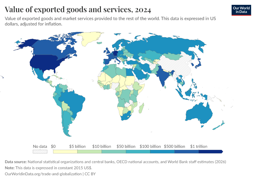 “Data Page: Value of exported goods and services”. Our World in Data (2026). Data adapted from National statistical organizations and central banks, OECD national accounts, and World Bank staff estimates. Retrieved from https://chart-preview-extension.owid.pages.dev:8789/20260202-181317/grapher/value-of-exported-goods-and-services.html [online resource] (archived on February 2, 2026).How to cite this data