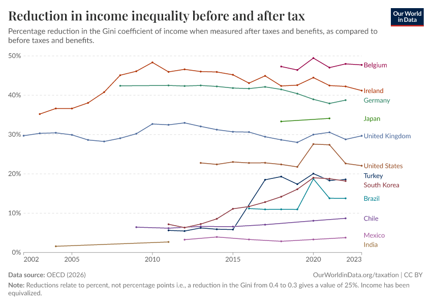 Joe Hasell (2023) - “Income inequality before and after taxes: how much do countries redistribute income?” Published online at OurWorldinData.org. Retrieved from: 'https://chart-preview-extension.owid.pages.dev:8789/20260119-065148/income-inequality-before-and-after-taxes.html' [Online Resource] (archived on January 19, 2026).BibTeX citation