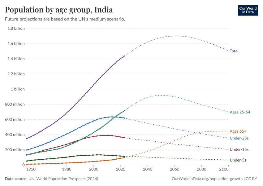 The chart here shows India’s population – split by age groups – from 1950 onwards, combined with the UN’s medium projection to 2100.