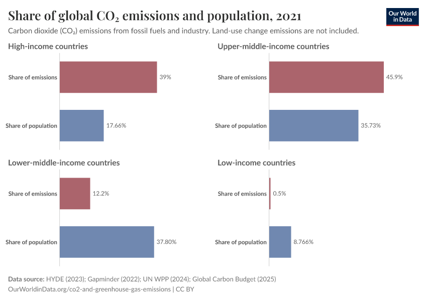 Instead, we see that high- and upper-middle income countries account for a much larger share of emissions than their population. Despite being home to just under half of the world population, they emit more than 80% of world’s CO2.