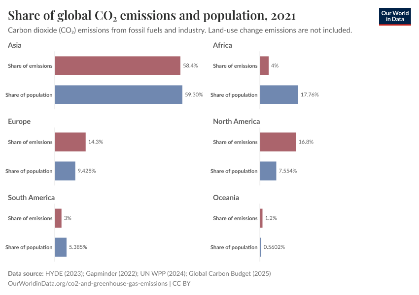 Europe, North America and Oceania all emit more than their ‘fair share’ based on population, whereas Africa and South America emit less.