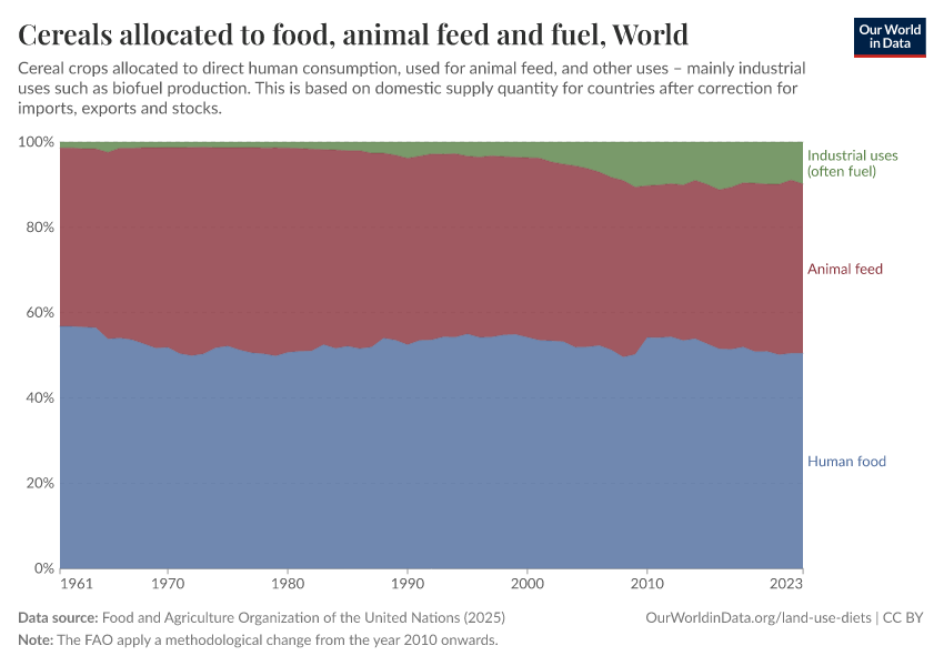 In the chart, we see the breakdown of what the world’s cereals are used for. This is split into three categories: direct human food (the rice, oats, wheat, bread, etc. that we eat); animal feed; and industrial uses (mainly biofuels).