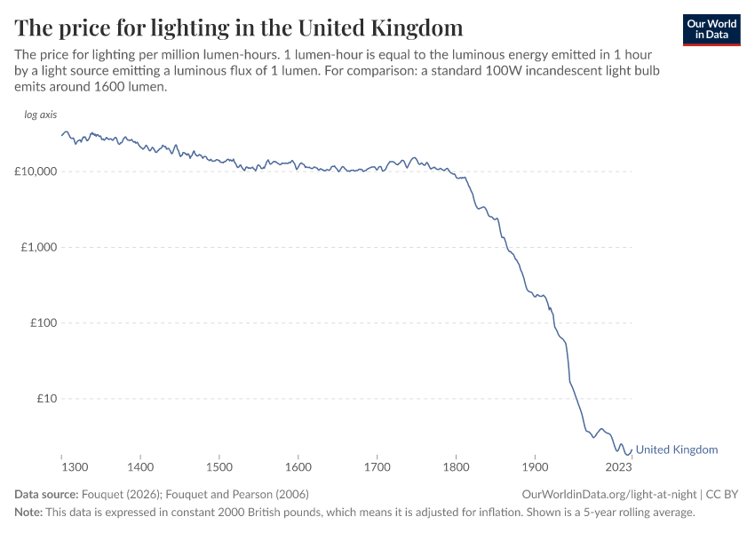 The price of light has fallen by more than 99.9% since 1700. And its efficiency has increased 1000-fold. This has made light at night available to more and more people.