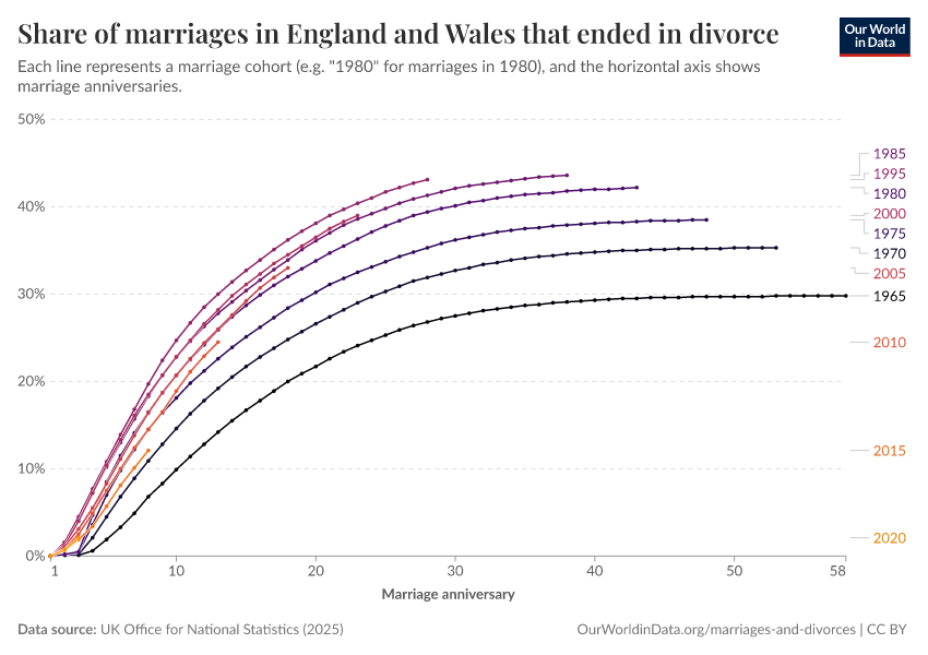 We see both of these factors in data on divorce rates from England and Wales. The chart maps out the percentage of marriages ending in divorce by cohort: each line represents the year the couple got married (those married in 1965, in 1970, etc.), and the horizontal axis is the number of years since the wedding.