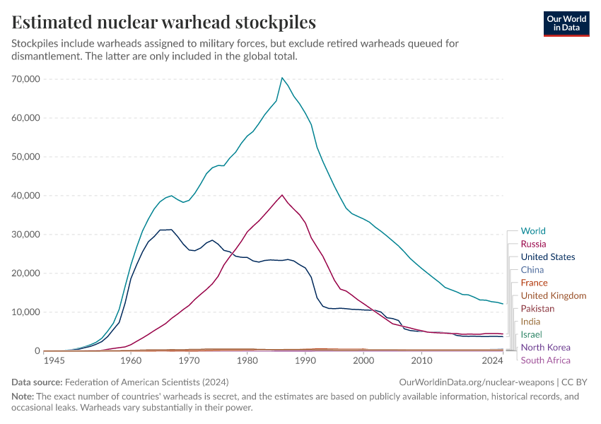 Bastian Herre, Pablo Rosado, and Max Roser (2024) - “Nuclear Weapons” Published online at OurWorldinData.org. Retrieved from: 'https://chart-preview-extension.owid.pages.dev/nuclear-weapons' [Online Resource]BibTeX citation