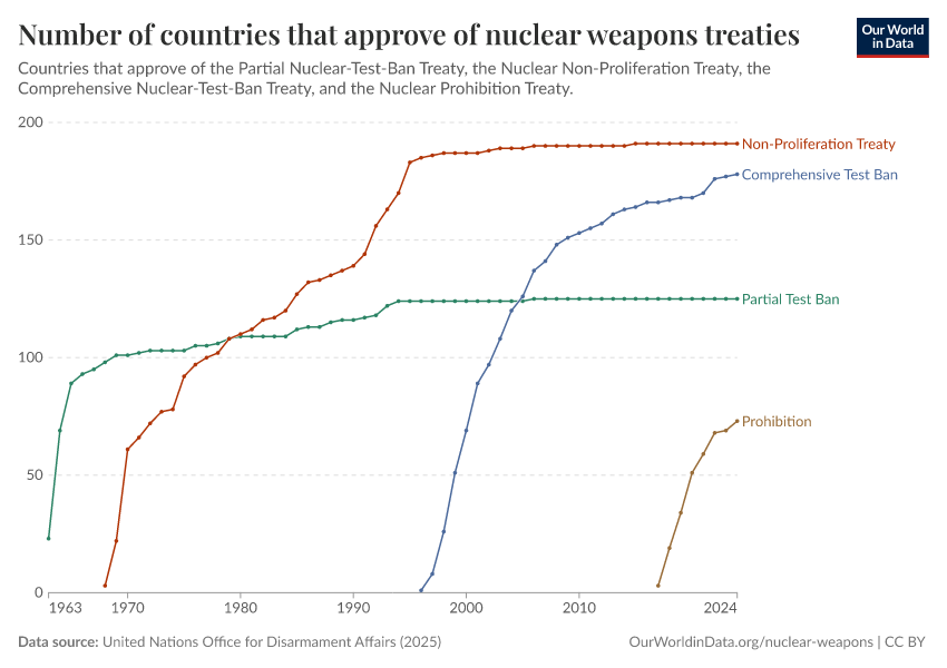 On this page, you can find writing, visualizations, and data on how many states have nuclear weapons, how many warheads they possess, how many oppose them, and how this has changed over time.