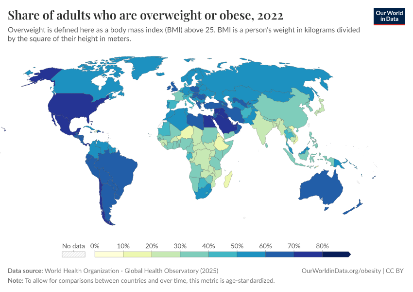 On this page, you will find global data and research on obesity — its prevalence, drivers, health consequences, and trends over time.