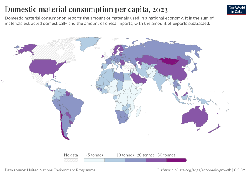 Domestic Material Consumption (DMC) measures the total amount of material directly used in an economy. It is a production-side measure which does not capture the amount needed for within-country demand. This means that a country with high levels of production for export could have a high DMC, while a country that outsources most of its material intensive industrial processes to other countries would have a low DMC.