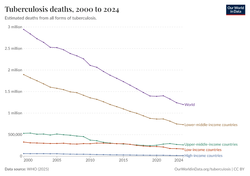 Hannah Ritchie and Fiona Spooner (2025) - “The end of tuberculosis that wasn’t” Published online at OurWorldinData.org. Retrieved from: 'https://chart-preview-extension.owid.pages.dev:8789/20260211-174736/the-end-of-tuberculosis-that-wasnt.html' [Online Resource] (archived on February 11, 2026).BibTeX citation