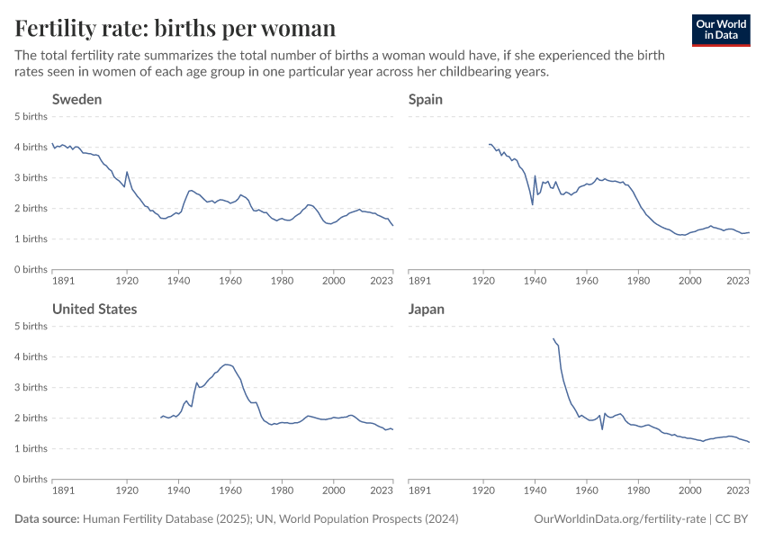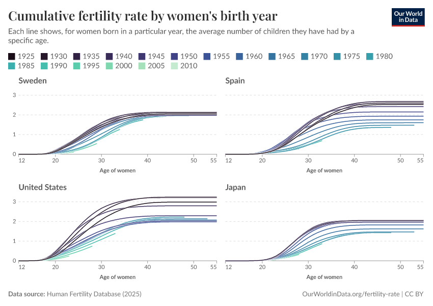 Saloni Dattani and Lucas Rodés-Guirao (2025) - “Why the total fertility rate doesn’t necessarily tell us the number of births women eventually have” Published online at OurWorldinData.org. Retrieved from: 'https://chart-preview-extension.owid.pages.dev:8789/20251125-173858/total-fertility-rate-births-per-woman.html' [Online Resource] (archived on November 25, 2025).BibTeX citation