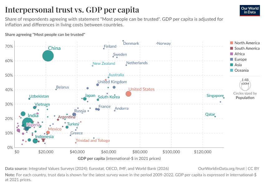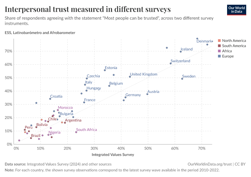 Esteban Ortiz-Ospina, Max Roser, and Pablo Arriagada (2016) - “Trust” Published online at OurWorldinData.org. Retrieved from: 'https://chart-preview-extension.owid.pages.dev/trust' [Online Resource]BibTeX citation