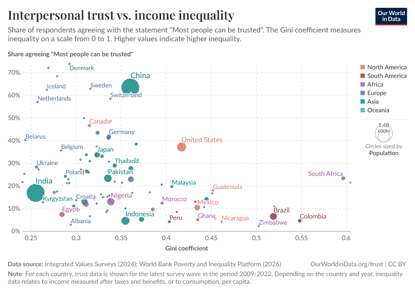 Each dot on this scatter-plot corresponds to a different country, with colors representing different world regions and dot sizes representing the size of the population. A Gini index of 0 would represent perfect equality, so the observed negative correlation in this graph shows that higher inequality is associated with lower trust.