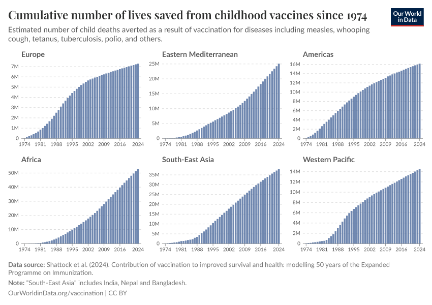 This has been a truly global effort, with more than 5 million children saved in every region, including over 50 million in Africa and 38 million in Southeast Asia. You can see the cumulative number of lives saved by WHO region in the chart below.
